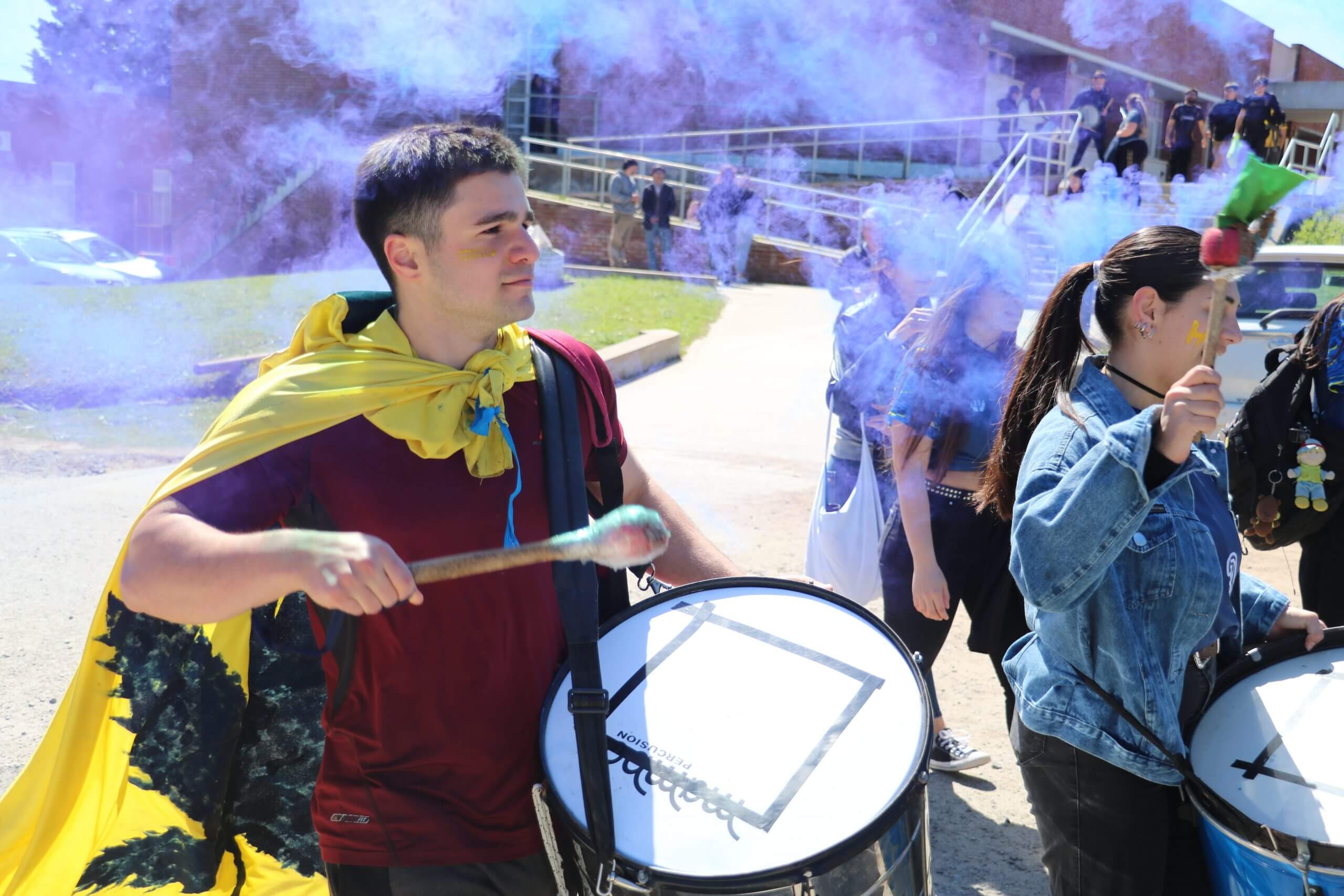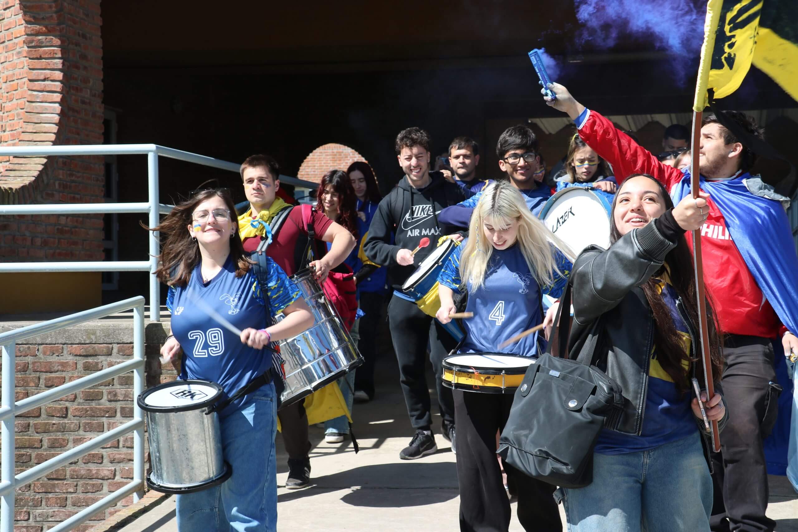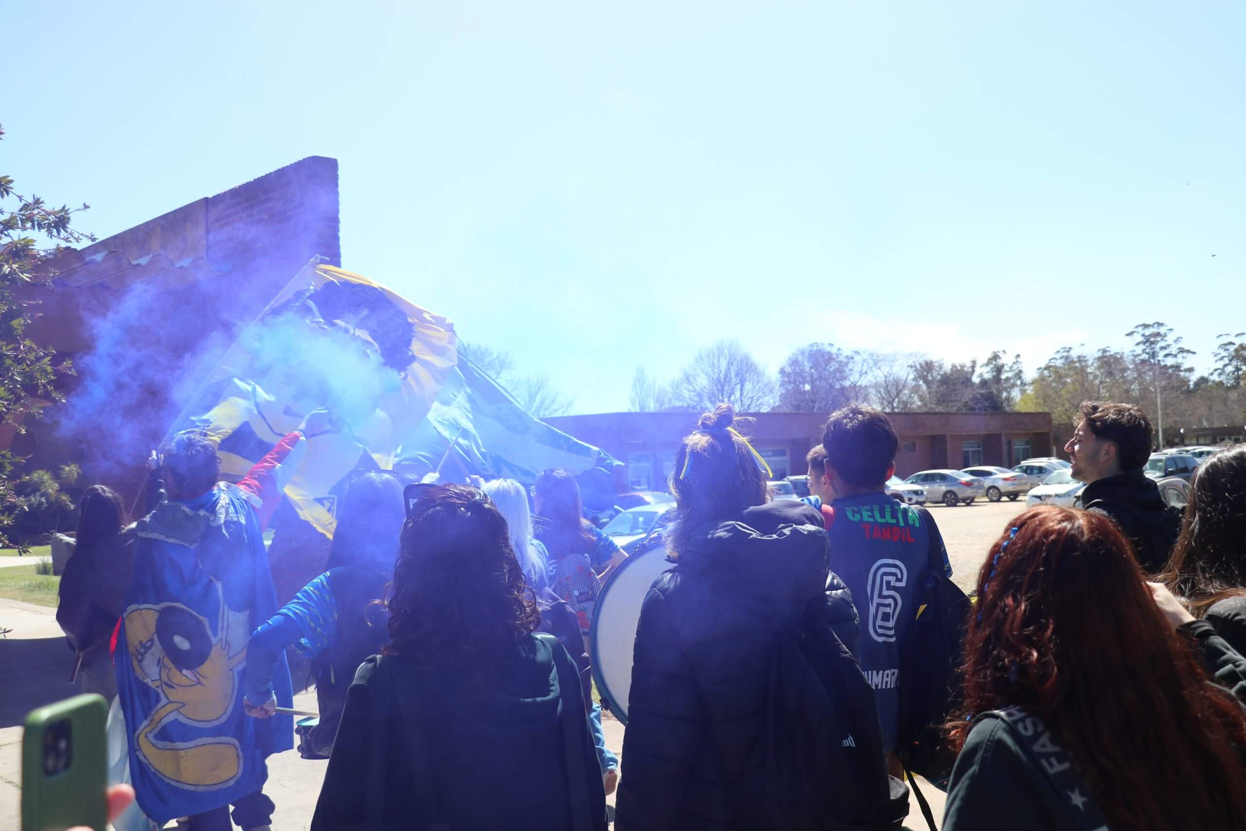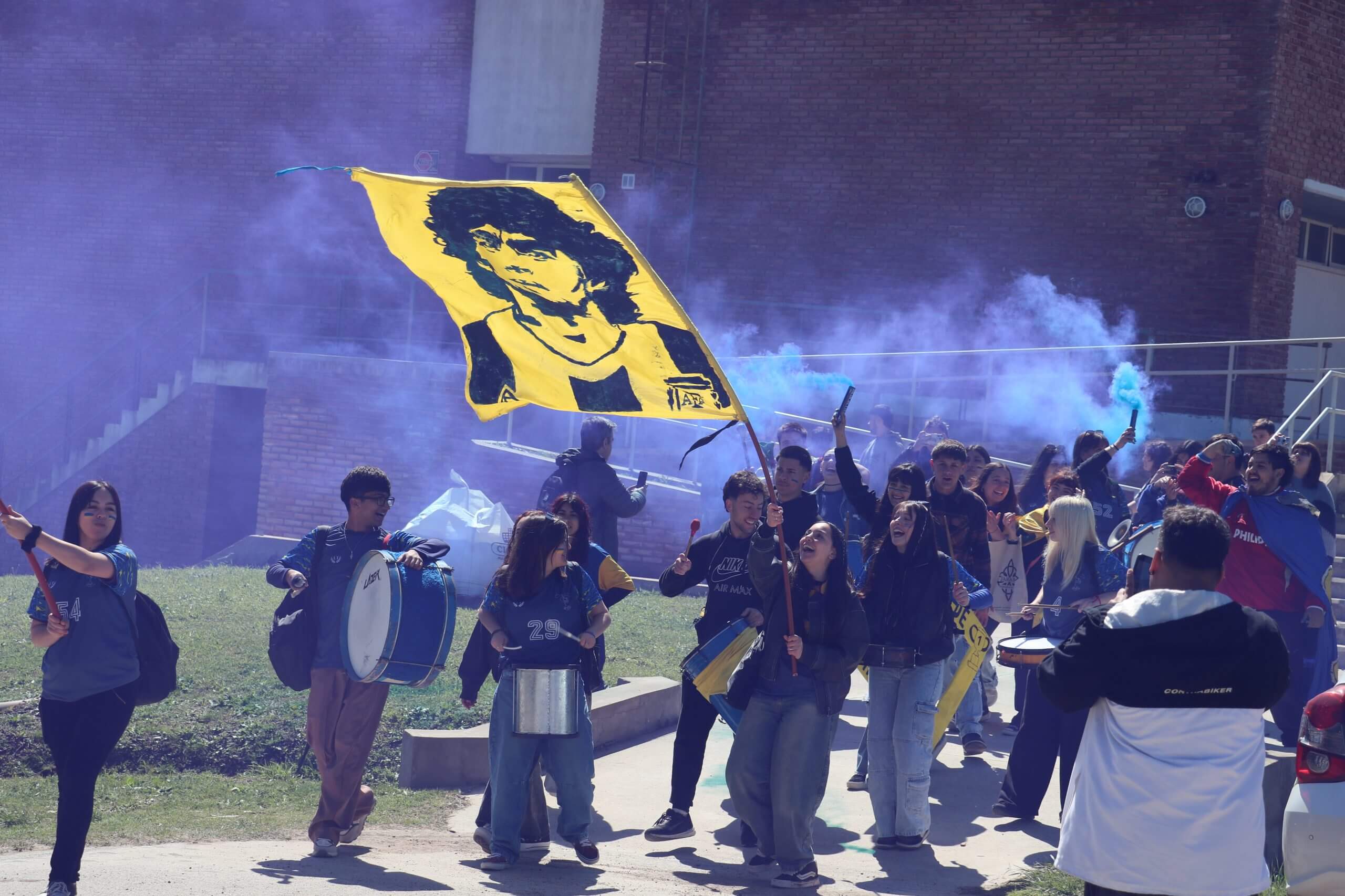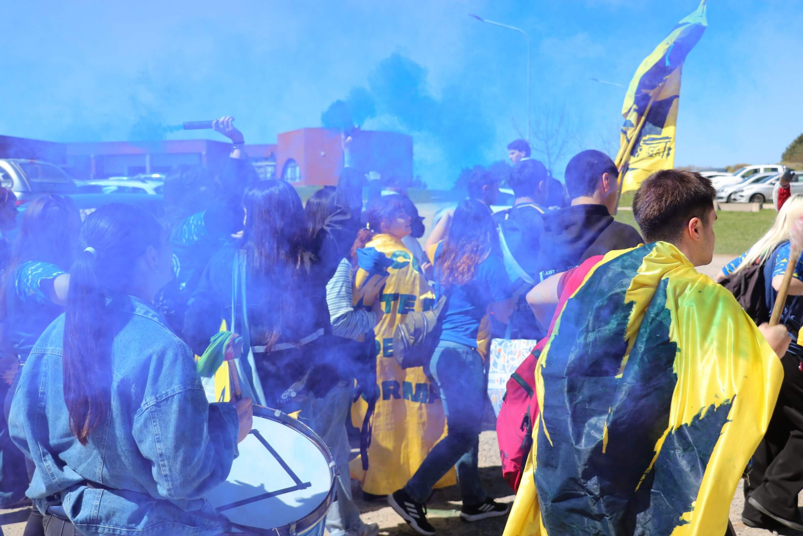 La previa de la FCH arrancó con todo. Lxs estudiantes caminaron juntos hacia el gimnasio, al ritmo de los bombos y bengalas que llenaron de color la entrada. Luego, ya en el predio, hicieron su clásica entrada triunfal con el boxitracio, sumando la energía de su mascota tradicional y los colores que identifican a la FCH.