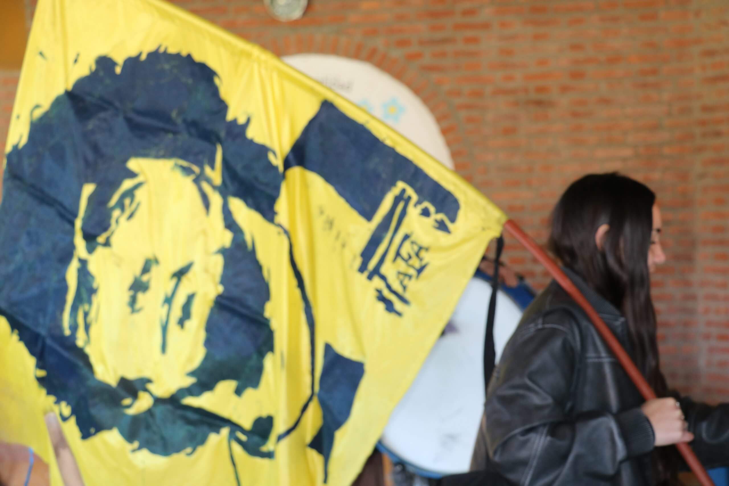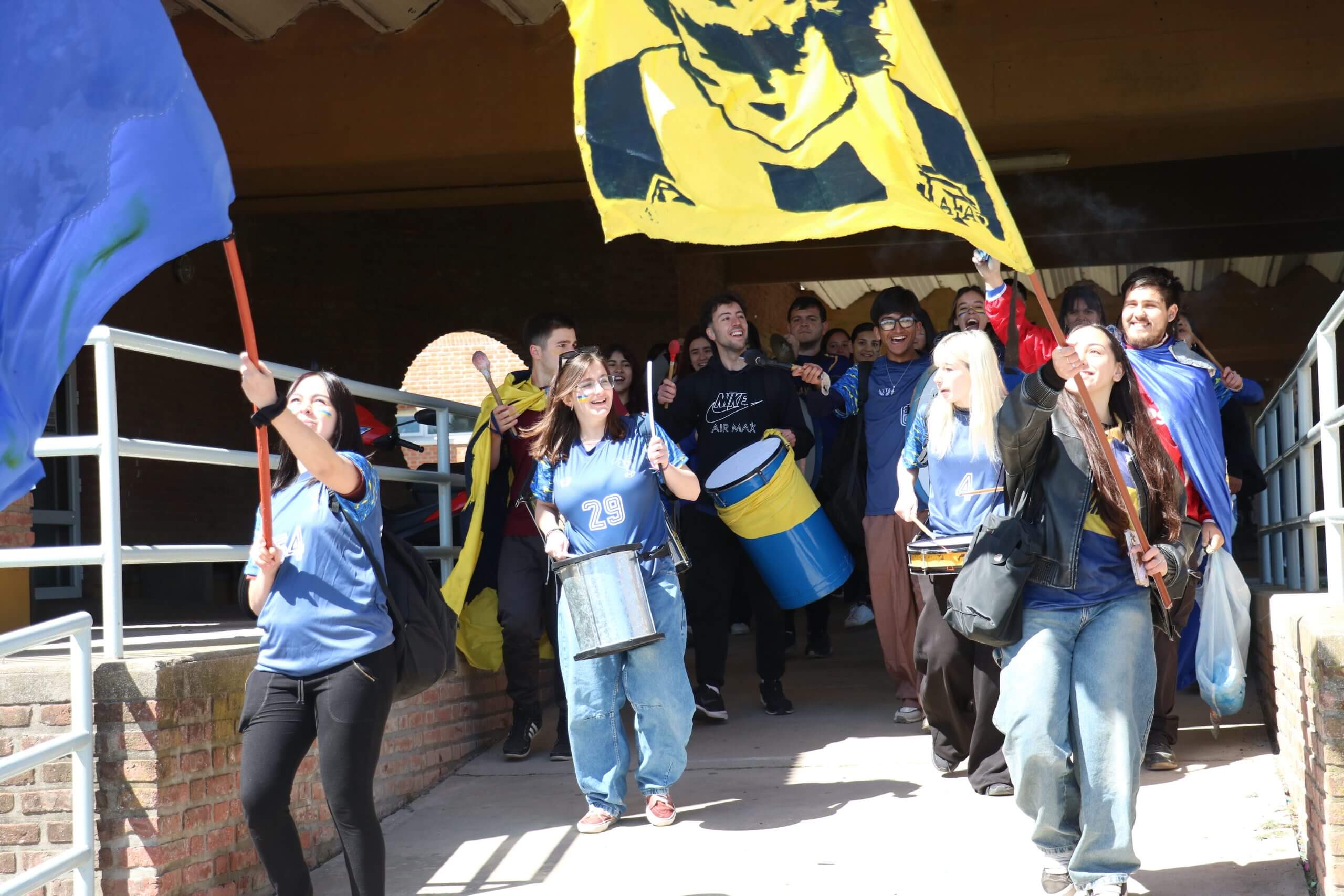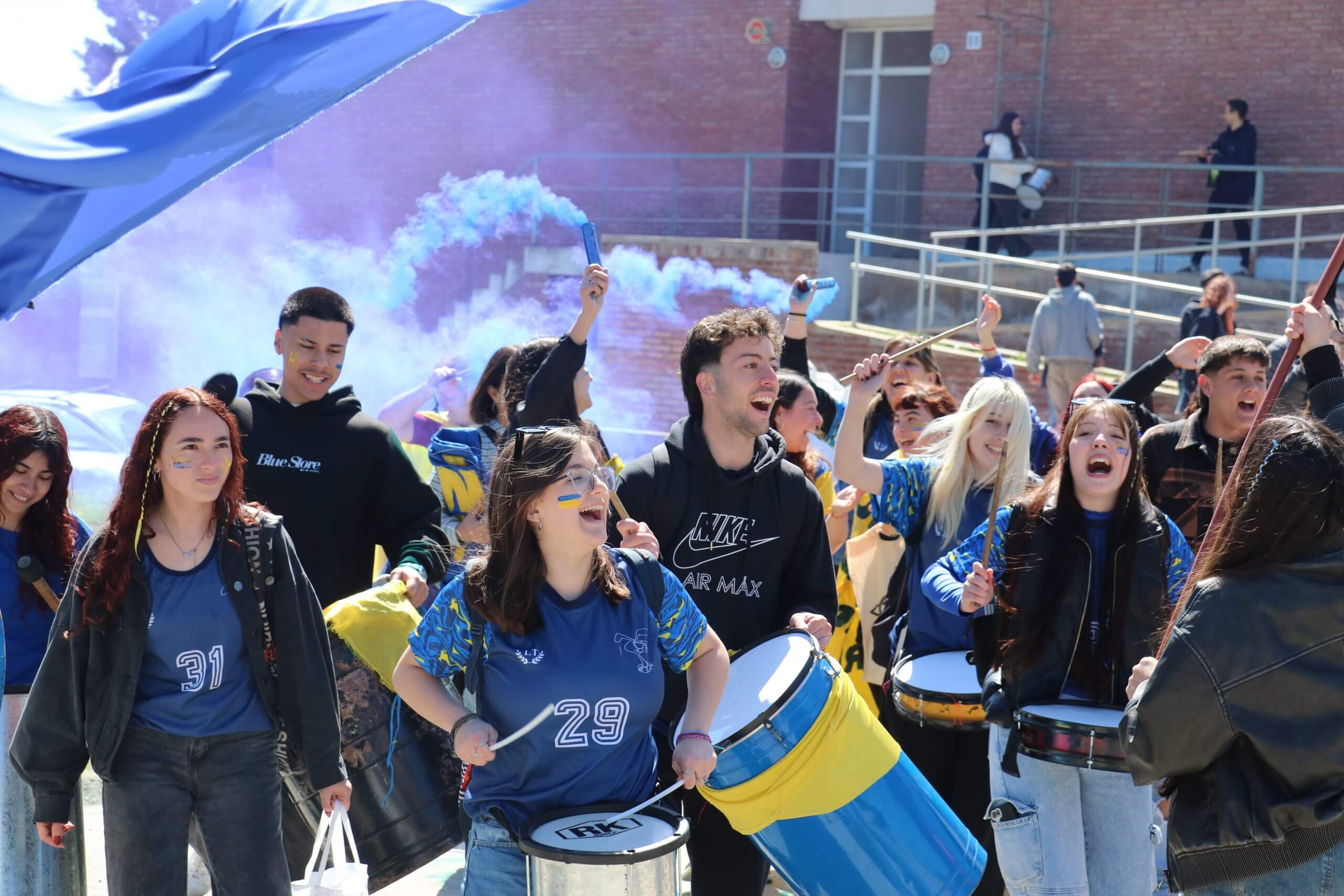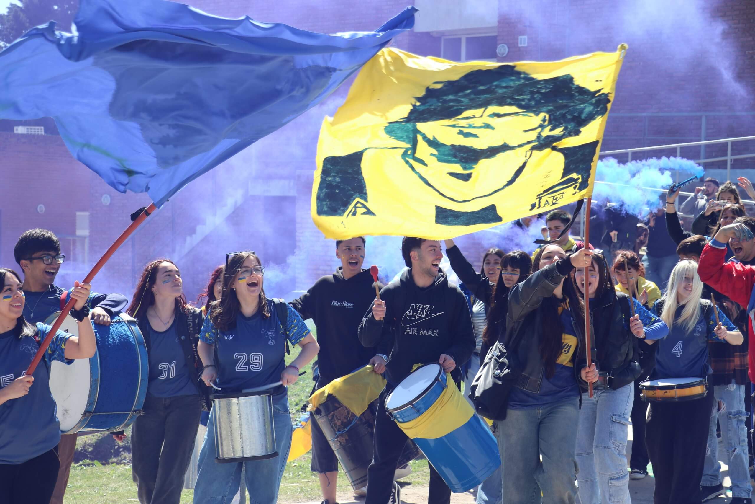 La previa de la FCH arrancó con todo. Lxs estudiantes caminaron juntos hacia el gimnasio, al ritmo de los bombos y bengalas que llenaron de color la entrada. Luego, ya en el predio, hicieron su clásica entrada triunfal con el boxitracio, sumando la energía de su mascota tradicional y los colores que identifican a la FCH.