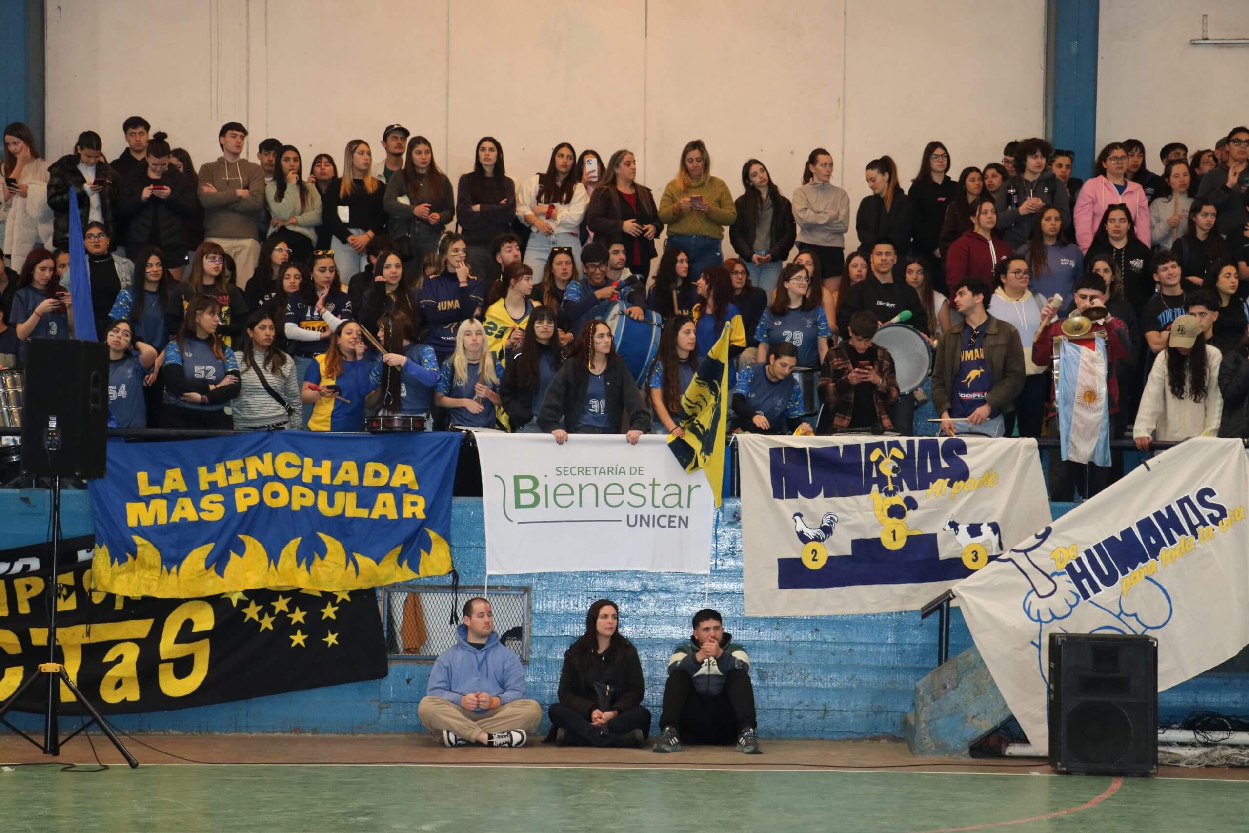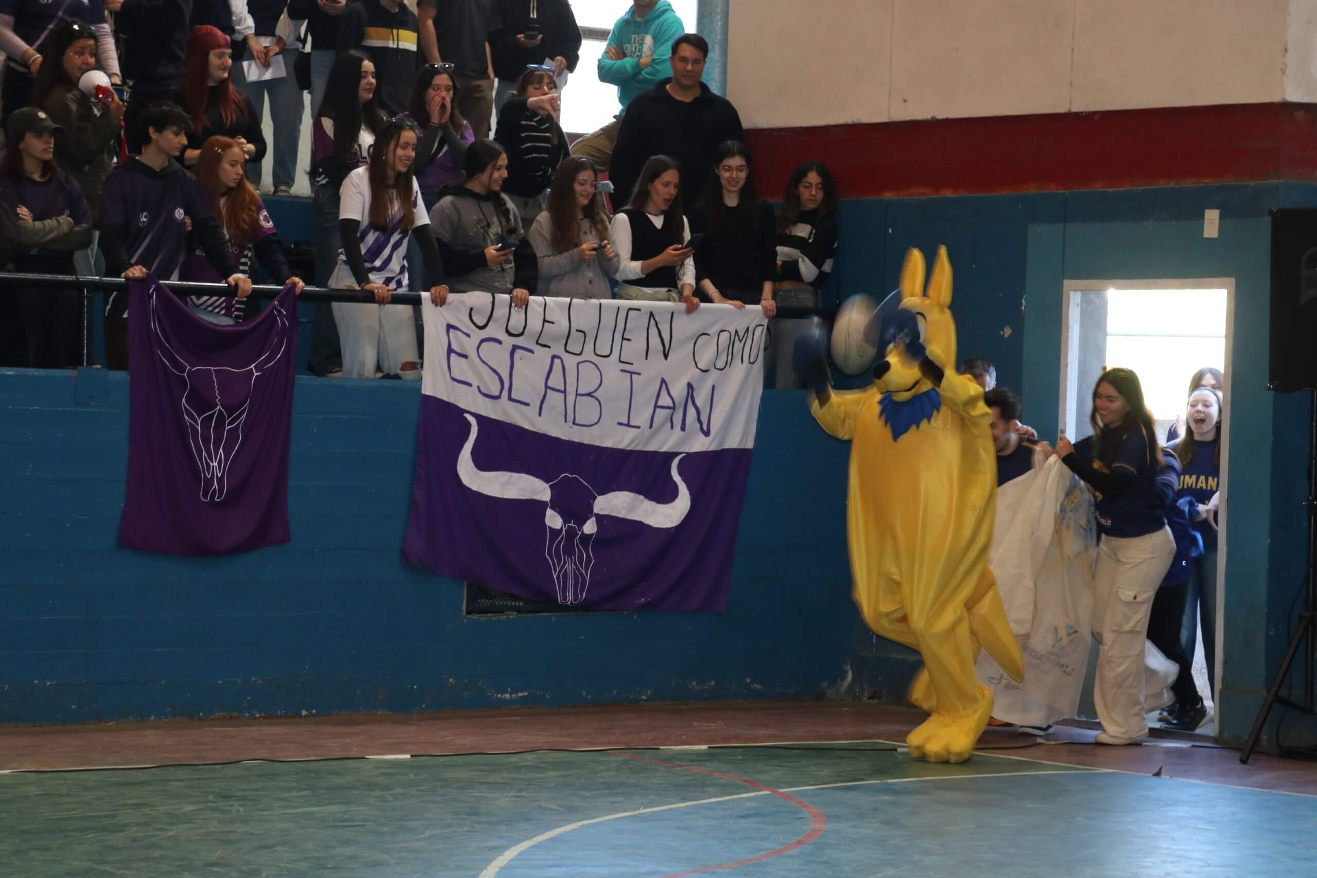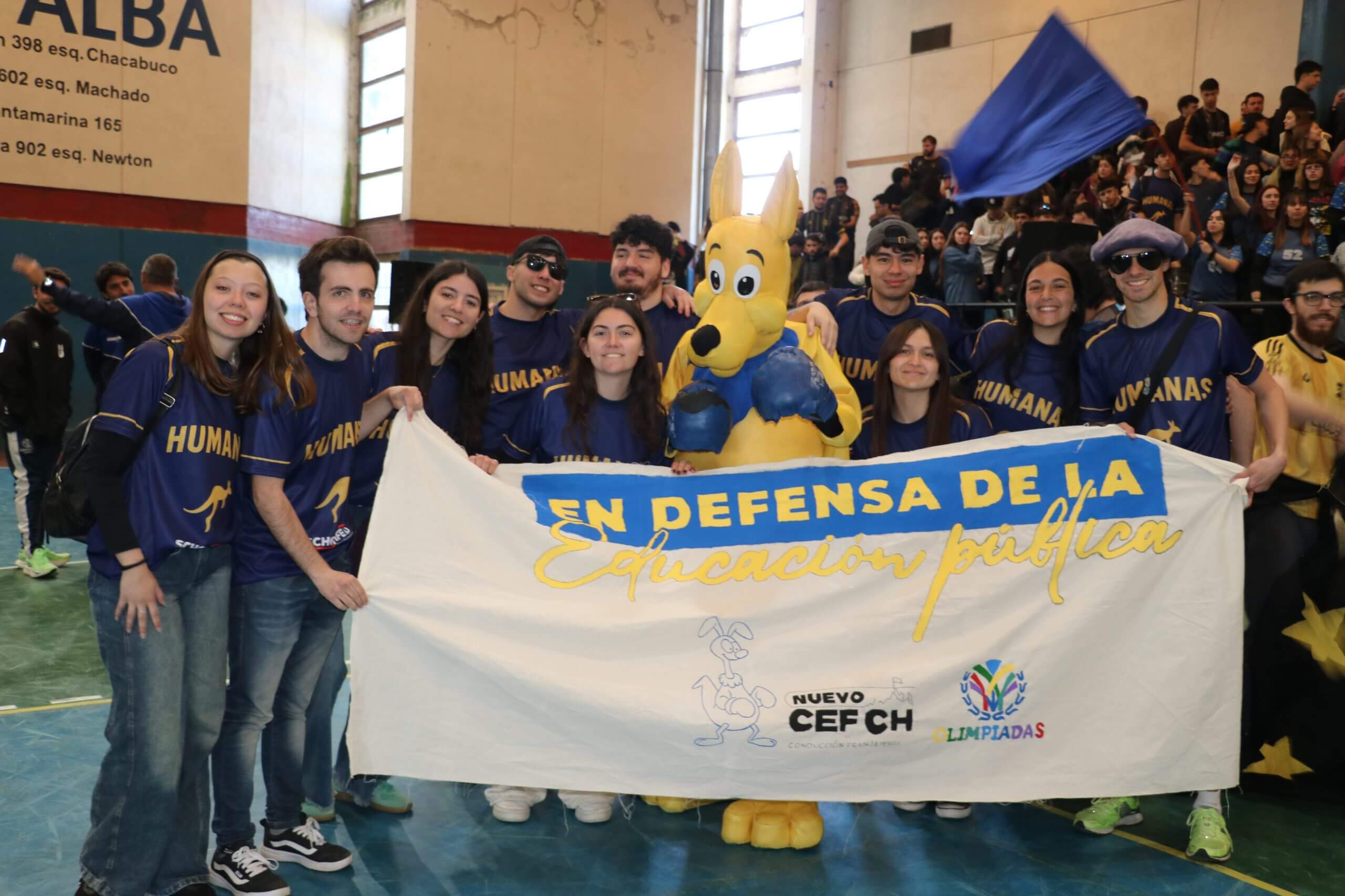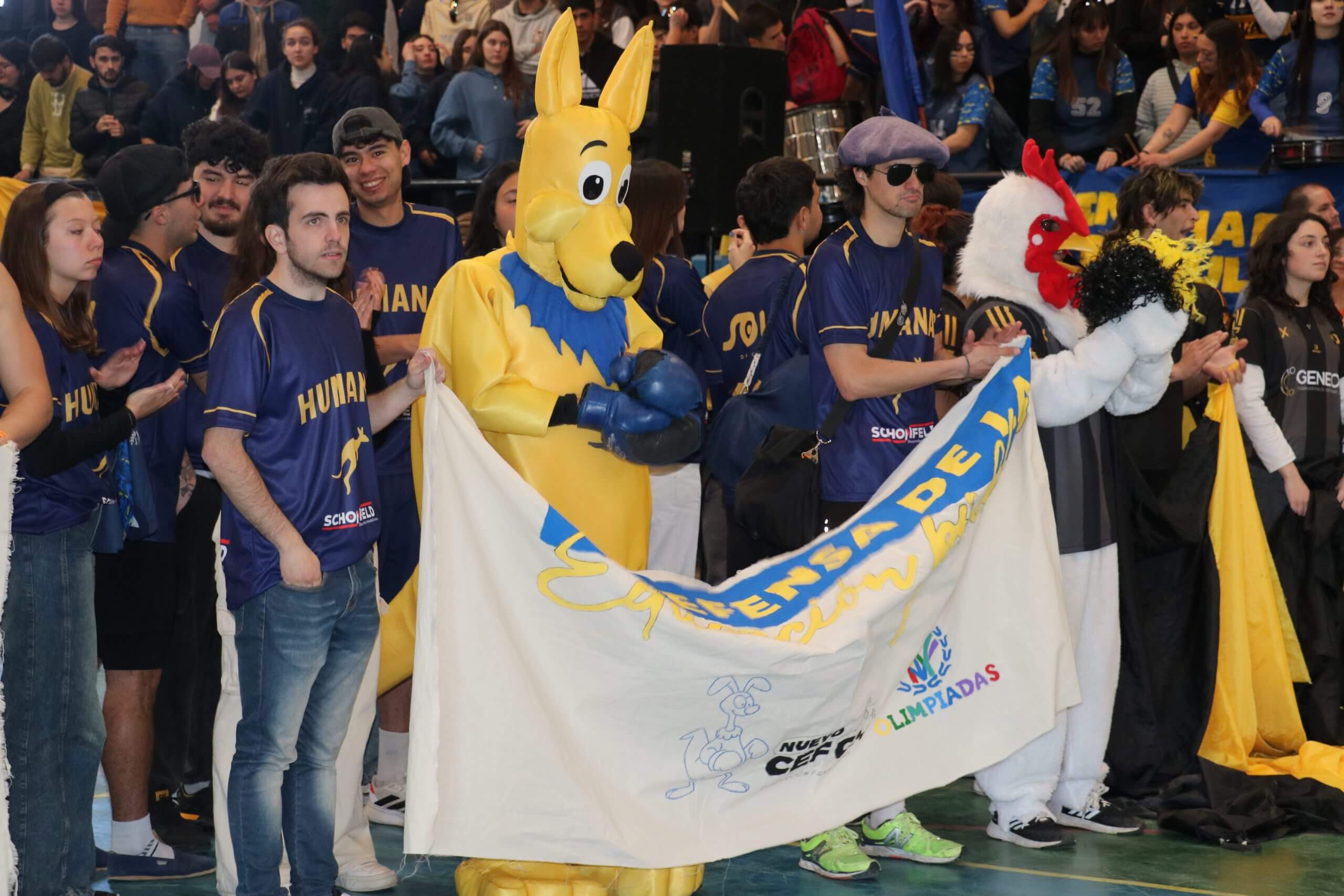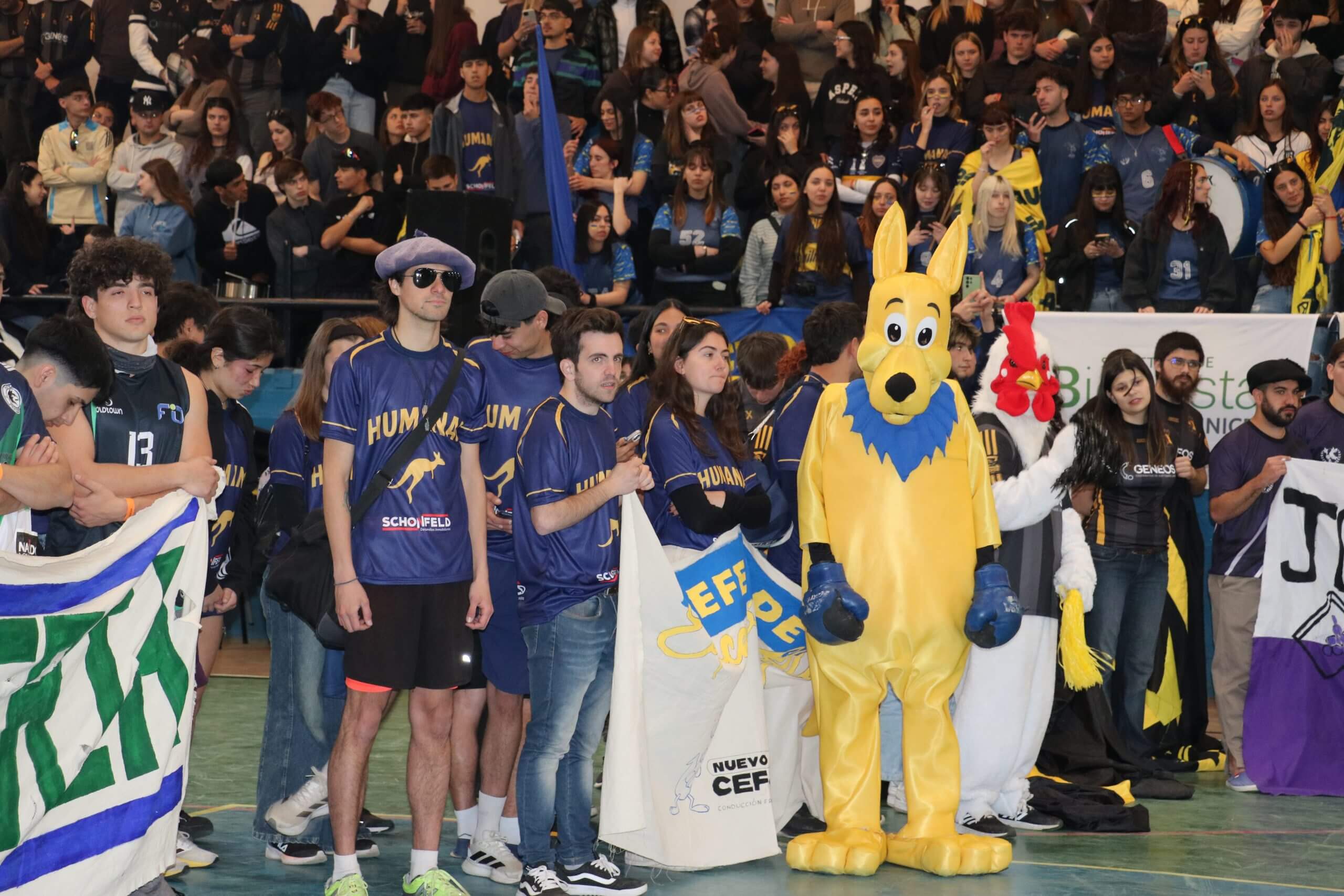 La previa de la FCH arrancó con todo. Lxs estudiantes caminaron juntos hacia el gimnasio, al ritmo de los bombos y bengalas que llenaron de color la entrada. Luego, ya en el predio, hicieron su clásica entrada triunfal con el boxitracio, sumando la energía de su mascota tradicional y los colores que identifican a la FCH.
