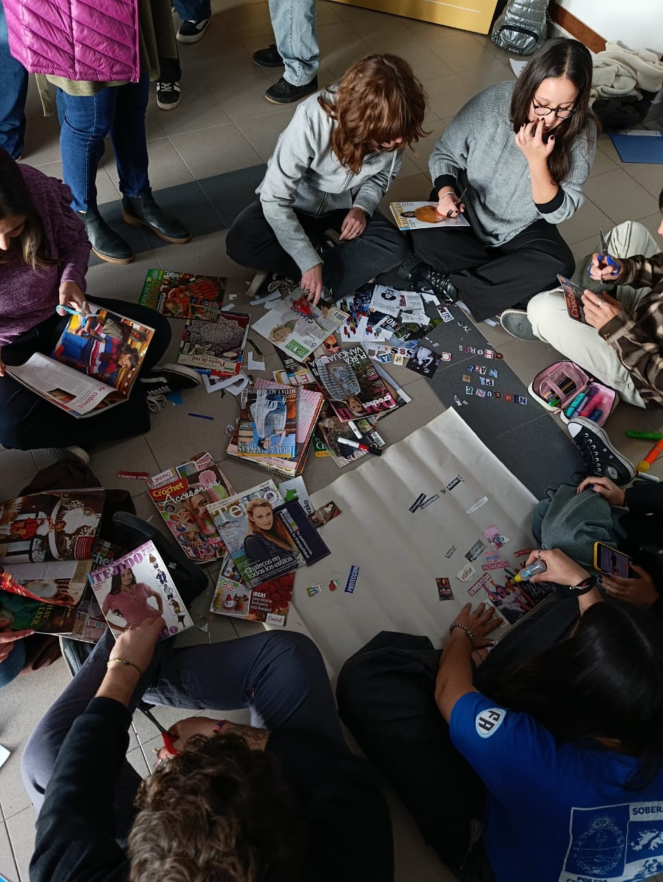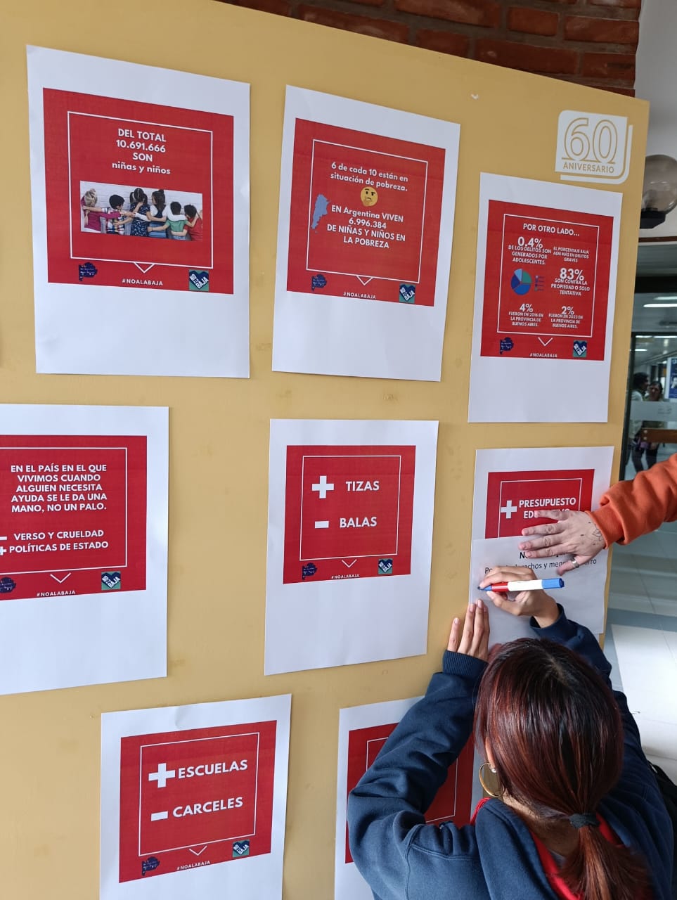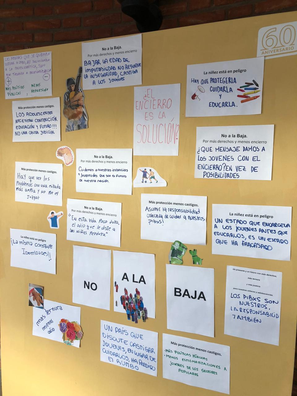 Durante la actividad se compartieron datos relevantes sobre la situación actual de las infancias en el país y sobre el sistema penal juvenil. También se presentaron placas informativas elaboradas junto al área de Comunicación Estratégica, las cuales fueron luego expuestas en los paneles del hall. Además, se realizaron collages colaborativos con consignas en clave de derechos, aportando a una construcción colectiva y crítica sobre el tema.